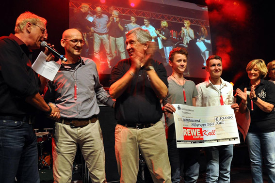 Die Hilfsgruppe konnte aber auch zwei Schecks entgegen nehmen. 2500 Euro überreichte die Kreissparkasse Euskirchen. 10.000 Euro vom Rewe-Center in Kall überreichte Jochem Hannes, stellvertretend für seinen Bruder und Marktmanager Rudi Hannes. Der Erlös stammte aus der großen Verlosung, die Rudi Hannes seit vielen Jahren für die Hilfsgruppe veranstaltet. Mit rund 200.000 Euro hat die Familie Hannes die Hilfsgruppe seit 1992 unterstützt.