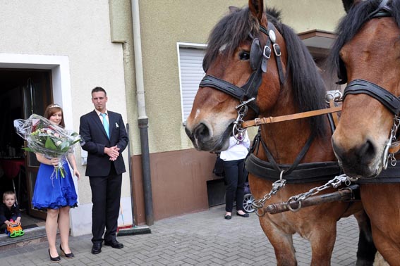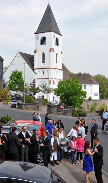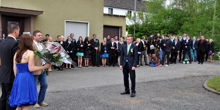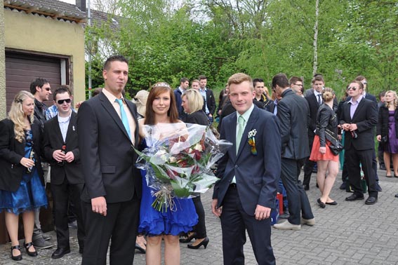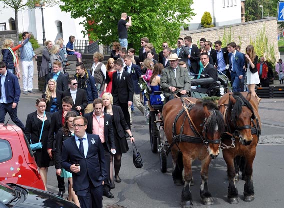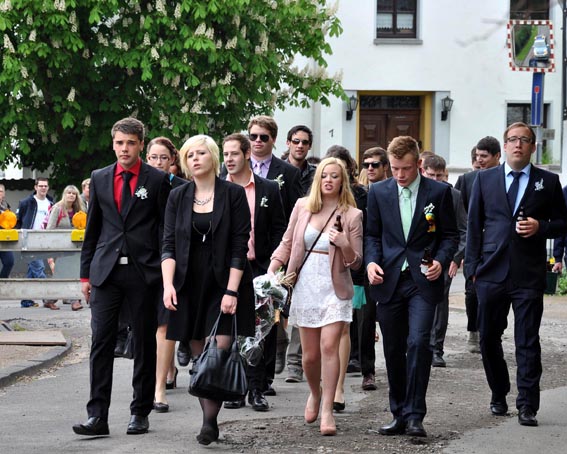 Am Mittag gegen 13 Uhr trudelten die Maipaare nach und nach am Maiplatz am Hallenbad ein, um mit dem Maikönig und der Musikkapelle Kall zum Haus der Königin in Kall-Heistert zu ziehen. Die Junggesellen hatten ihre Arbeitsklamotten, in denen sie eine Woche lang am Maiplatz campiert hatten, gegen schicke Anzüge getauscht. Ihre müden Augen hatten sie hinter dunklen Sonnenbrillen versteckt. Und auch die Damen hatten sich für den Umzug zum Maiball besonders hübsch gemacht.