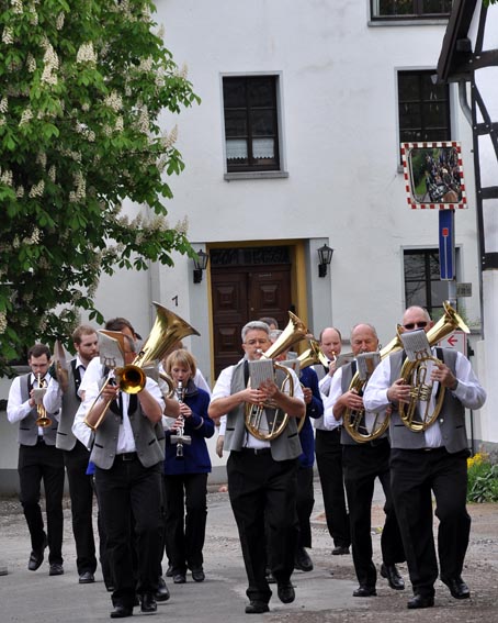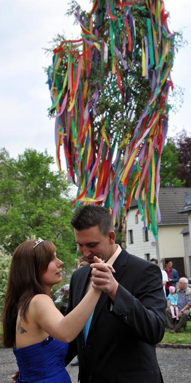 Bevor der Hötjong des Geloogs, Bastian Pütz, das Maipaar zum Walzertanz im Schatten des riesigen Maibaumes bat, überreicht er Blumensträuße an die Lebensgefährtin des Ortsvorstehers und an die Mutter des Maikönigs. „Der Mai ist gekommen…“ intonierte die Musikkapelle, und das Maipaar legte den obligatorischen Walzer auf das Hof-Pflaster hin, während die Königsmutter zum Umtrunk bat.