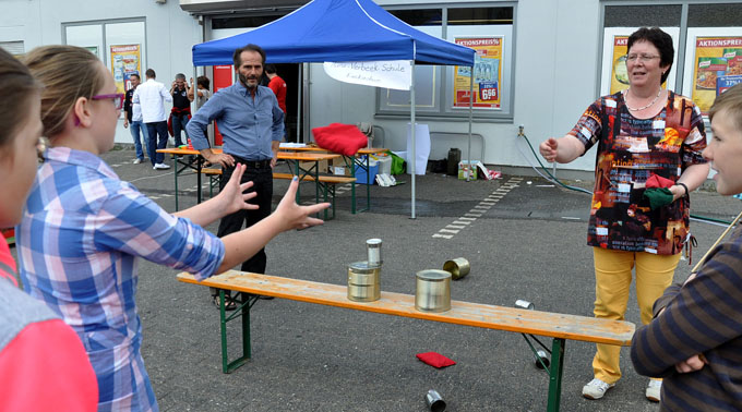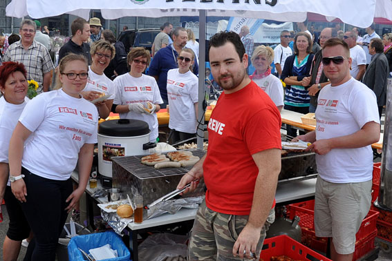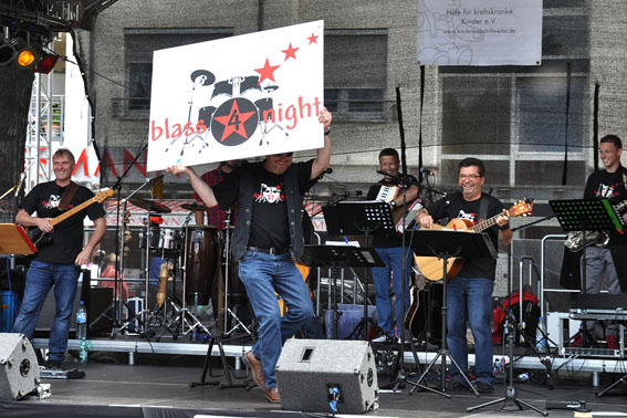 Getreu der Devise „Wenn wir was machen, machen wir es richtig“ hatte die Hilfsgruppe den gesamten Bleibergplatz am REWE-Markt in Beschlag genommen. Auf einer großen Konzertbühne präsentierte der Moderator und Sänger Julien Heldt ein achtstündiges Nonstop-Programm. Der REWE-Markt unterstützte die Aktion der Hilfsgruppe unter anderem damit, dass er eine große Tombola mit tollen Preisen bestückte.