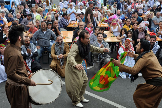 Das tat auch eine Gruppe Iraker die der Hilfsgruppe, die vor zwei Jahren das Leben eines kurdischen Landsmannes gerettet hatte, auf besondere Art und Weise dankte: Der in Euskirchen tätige Friseur Karwan Mohamed, dessen Bruder der Hilfsgruppe sein Leben verdankt, hatte für den Auftritt der Gruppe gesorgt, die er am Sonntagmorgen in Euskirchen zusammen getrommelt hatte. Er hatte bei seinen in der Kreisstadt wohnenden Landsleuten einen Rundruf gestartet und zum Tanz bei der Hilfsgruppe aufgerufen.