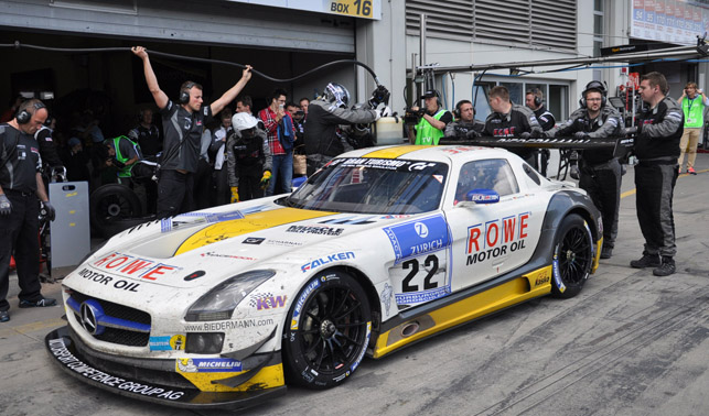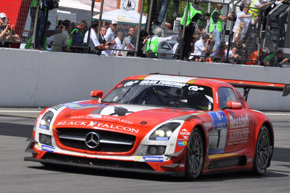 Zweiter nach der 24-Stunden-Hatz wurde der Black-Falcon-Mercedes SLS AMG GT3 mit den Fahrern Jeroen Bleekemolen, Andreas Simonsen, Lance David Arnold und Christian Menzel, der sich das schönste Geschenk zu seinem 43. Geburtstag machte, den er am Sonntag feierte.