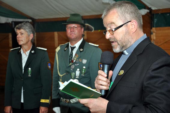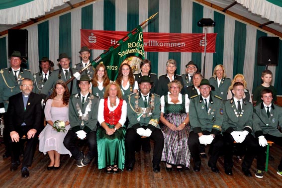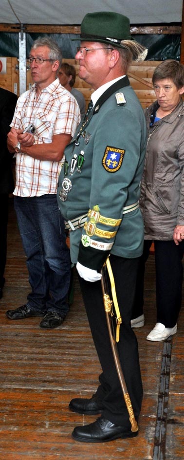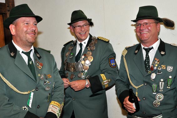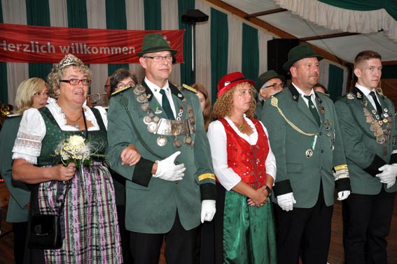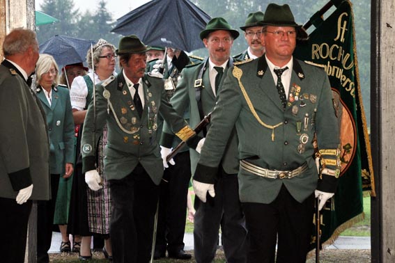Infolge der einsetzenden Regengüssen verzichtete die Bruderschaft auf den obligatorischen mit Musik begleiteten Marsch zum Festzelt. Der Saaleinmarsch erfolgte vom Vorplatz des Zeltes aus, wobei die Stehtischmusikanten den Einmarsch intonierten. Bevor Präses Pater Wieslaw Kaczor die alten Majestäten verabschiedete und die neuen Würdenträger krönte, bedankte er sich bei den Mitgliedern der Bruderschaft für ihre rege Teilnahme am kirchlichen Geschehen.