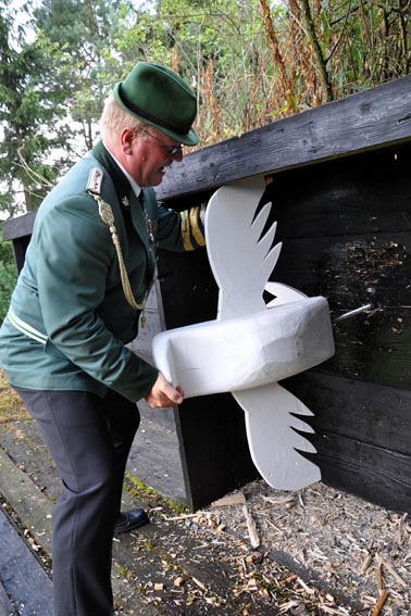 Schießmeister Andreas Wittig („Jeder Schuss kostet 1,30 Euro“) bangte schon, zu wenig Munition zu haben, denn er hatte „nur“ 120 Patronen mit zum Schießstand gebracht. Es war schließlich der 93. Schuss, mit dem Dieter Krahe dem Vogel den Garaus machte und Schießmeister Wittig aufatmen ließ.