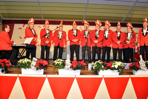 Mit einem von den Kallern mit Spannung erwarteten Vortrag brachten die Rotröcke des Vereins mit dem Pianisten Stefan Kupp das 64 Jahre alte Kaller Karnevalslied „Mir sen die löstije Bröder vun Kall“ wieder auf die Bühne. In der Session 1949/50 hatte der damalige Kappenfreund Mathias Reul die Vereins-Hymne geschaffen, die jedoch im Verlauf der Jahrzehnte in Vergessenheit geriet und inzwischen unbekannt war. Den Kallern gefiel das Lied, so dass die „Chorknaben“ des Vereins es zweimal vortragen mussten.