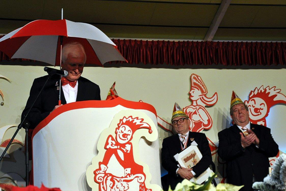 Mit dem Einmarsch des Präsidenten Werner Keutgen und des Moderators Ralph Drehsen begann der Festabend. Dann stieg als erster der Schirmherr und Bürgermeister Herbert Radermacher in die Bütt – ausstaffiert mit einem Schirm in den rot-weißen Vereinsfarben der „Löstige Bröder“. Das Gemeindeoberhaupt blickte in einem lustigen Vortrag auf das 111-jährige Vereinsgeschehen zurück. Radermacher („Ihr habt es geschafft, den Bürgermeister in die Bütt zu bekommen“) dankte dem Verein für die finanzielle Unterstützung der Jugendeinrichtung „Schülercafé“, der die „Bröder“ drei Euro je Eintrittskarte zukommen lassen.