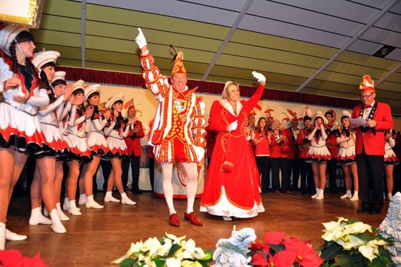 Auch für das Prinzenpaar Harald und Simone Thelen endete die Amtszeit mit der Inthronisierung ihrer Nachfolger, deren Saal-Einzug mit großer Spannung erwartet wurde. Erst als Prinz Hans II. (Lambert) mit seiner Prinzessin Gabi I. im Funkenregen von fast vierhundert Wunderkerzen und in Begleitung der Prinzengarde die Bühne eroberten, war das Geheimnis gelüftet. So mancher im Saal musste erkennen, dass er auch diesmal wieder mit seinem Tipp, wer wohl Prinz in Kall werde, falsch gelegen hatte.