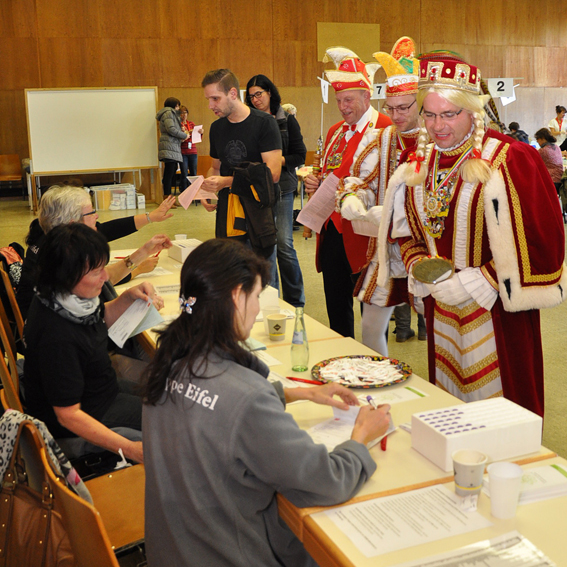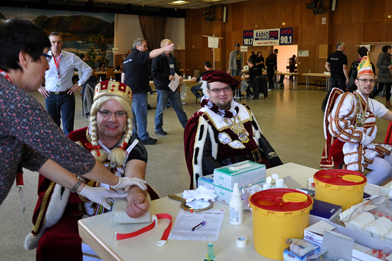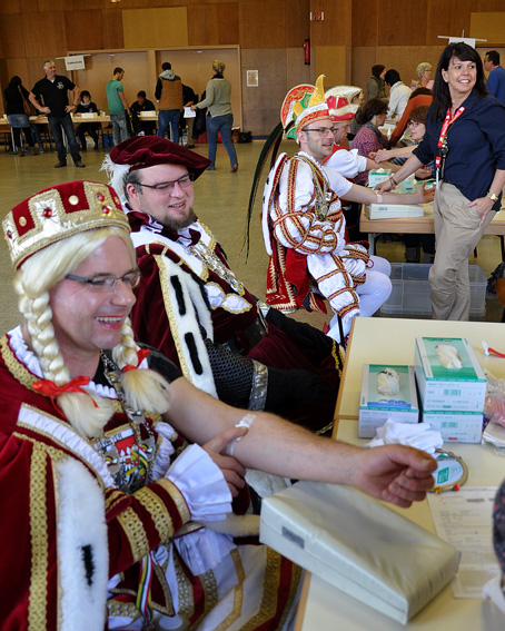 Ein Hauch von Karneval kam auf, als am Mittag das Dreigestirn der KG „Weyer Blömche“, das erst am Vorabend in Weyer inthronisiert worden war, im vollen Ornat zum Bluttest kam. Prinz Björn (Wassong), Bauer Michael (Hochgürtel) und Jungfrau Michaela (Lock) „fütterten“ zudem auch noch die Spendenkasse der Hilfsgruppe und überreichten dem Vorsitzenden Willi Greuel noch einen Orden.