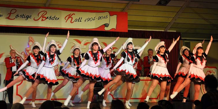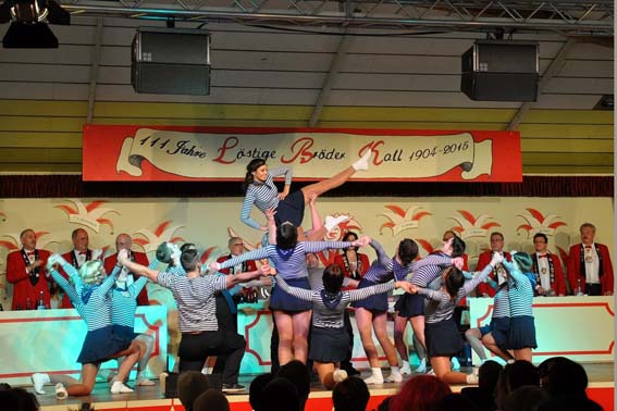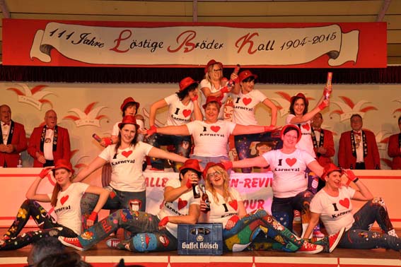 Bei der Sitzung anlässlich des närrischen Geburtstags wurde auch erneut deutlich, dass die 1992 nach der Vereins-Wiederbelebung erklärte Devise „Met ejene Saache, Freud üch maache“ in Kall noch immer Gültigkeit hat. Das Solomariechen Jana Schnichels ist aus Kaller Sitzungen nicht mehr wegzudenken. Eine akrobatische Darbietung bot die gemischte Showtanzgruppe der Löstige Bröder. Ebenso die Kallbachmücken, die seit dieser Session von Meike Wilkens trainiert werden, und die sich wieder als starke Truppe präsentierten. Im nächsten Jahr ist es genau 50 Jahre her, dass die wohl älteste Garde in der Region gegründet wurde.