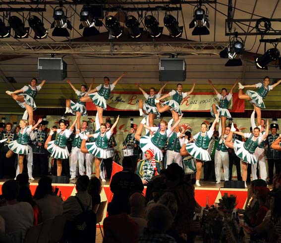 Ihm folgte die Musikgruppe „Birkesdörper Buure Band“, die sogleich den Saal in ein Tollhaus verwandelte und schon frühzeitig den Zeitplan sprengte. Weitere auswärtige Kräfte waren der Bauchredner Marcus Magnus mit dem frechen Vogel Charly, das Redner-Duo Hans Dieter Hahn und Rainer Krewinkel als „Botz & Bötzje“ sowie die KG Husaren Grün-Weiß Siegburg, die mit Musikzug, Gardisten und personenstarker Tanzformation die Bretter der Bürgerhallenbühne erzittern ließ.