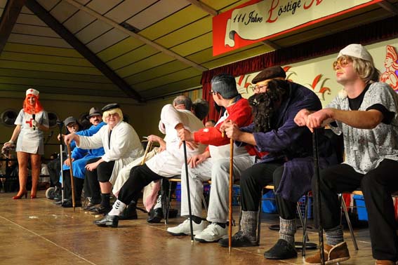 Kein Auge blieb trocken, als die Prinzengarde die Bühne erklomm. Diesmal allerdings nicht mit zackigem Einmarsch in schmucker Uniform, sondern behäbig, gebückt und in Bademäntel gekleidet, mit Rollstuhl, Rollator, Krücken und Gehstöcken. Die Botschaft der gealterten Gardisten war eindeutig: „Wir sind Gründungsmitglieder des Vereins“. Die Altersheim-Abteilung wurde bei ihrem Sketch von einer Krankenschwester gehegt und gepflegt, ob beim Zähneputzen mit der Klobürste oder bei der kollektiven Sitzung auf dem stillen Örtchen.