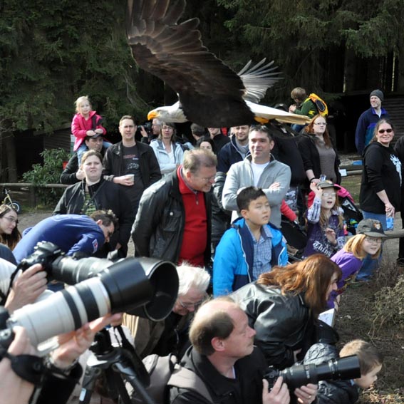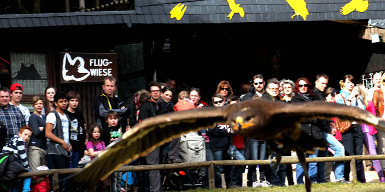 Bei den Flugvorführungen an der Greifvogelstation herrschte dichtes Gedränge. Hunderte Zuschauer verfolgten die spektakulären Flüge der Greifvögel. Ute Niesters war zufrieden, denn schon in den Tagen zuvor, hatte das gute Wetter dem Gehege viele Besucher beschert.