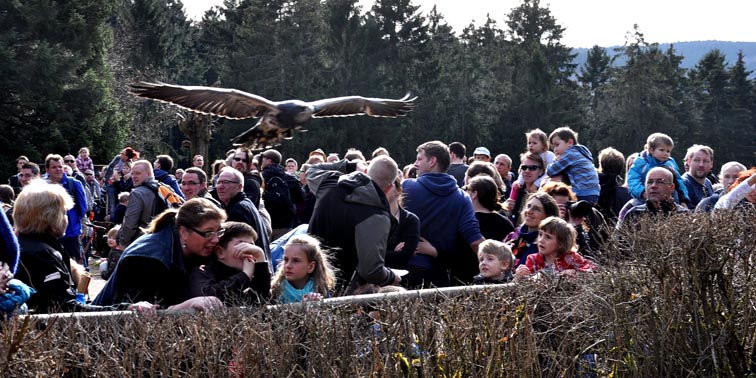 Bei den Flugvorführungen an der Greifvogelstation herrschte dichtes Gedränge. Hunderte Zuschauer verfolgten die spektakulären Flüge der Greifvögel. Ute Niesters war zufrieden, denn schon in den Tagen zuvor, hatte das gute Wetter dem Gehege viele Besucher beschert.