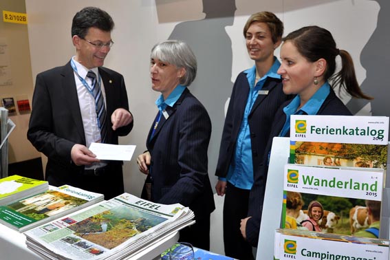 Das Wahrnehmungsdefizit durch die Gäste ist jedoch der einzige Makel am Eifeltourismus: Sowohl Garrelt Duin, NRW-Minister für Wirtschaft, Energie, Industrie, Mittelstand und Handwerk, als auch Staatssekretär Dr. Günther Horzetzky lobten beim Besuch des Messestandes die rasante Tourismus-Entwicklung der Eifel. Die Landesgartenschau in Zülpich, der Nationalpark, die Monschauer Festspiele und nicht zuletzt die Burg Vogelsang seien Tourismus-Magnete gewesen.