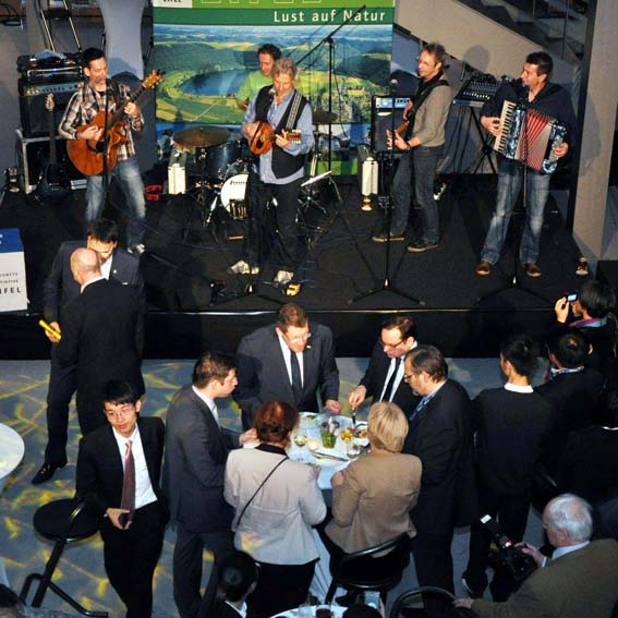 Auf der ITB vertreten waren auch die Eifelrocker „Wibbelstetz“, die gleich zwei furiose Auftritte absolvierten. Nachdem sie dienstags im vollbesetzten Gaffelhaus nahe des Bahnhofs Friedrichsstraße musiziert hatten, spielten sie mittwochs beim Eifel-Ardennen-Abend in der NRW-Landesvertretung auf. An diesem Abend stand die Zukunftsinitiative Eifel, bei der ein Wechsel im Präsidium bevorsteht, im Mittelpunkt. Der scheidende Vorsitzende des Präsidiums, Aachens Städteregionalrat Helmut Etschenberg, und dessen Vorstandskollege, Landrat Dr. Joachim Streit (Bitburg-Prüm), gaben ihre Ämter in Form zweier Staffelstäbe an den Landrat Heinz-Jürgen Thiel (Vulkaneifelkreis) und an den Dürener Landrat Wolfgang Spelthahn weiter.
