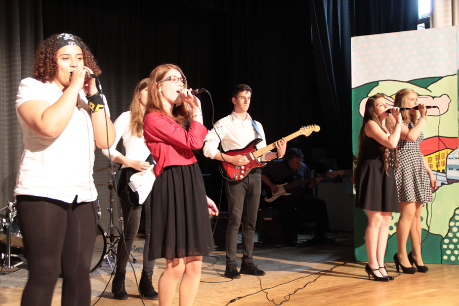 Für Abwechslung im wortlastigen Programm sorgten die Schülerinnen und Schüler des Gymnasiums, die verschiedene Filme vorbereitet hatten, den Unterricht vor 100 Jahren auf die Schippe nahmen, und musikalische Beiträge präsentierten. Julie Meyer glänzte als Marlene Dietrich und präsentierte unter einer kleinen Laterne „Lili Marleen“, begleitet am Klavier von Fabio Schmitz. Werner Harzheim und Wolfgang Gerhardts, zwei ehemalige Schüler, spielten vierhändig Dvoraks „Slawische Tänze“. Durch das Programm führten Kamila Gänsler-Thomas und Nicole Kupp. Am Nachmittag startete ein großes buntes Programm, bei dem die ganze Schule involviert war.