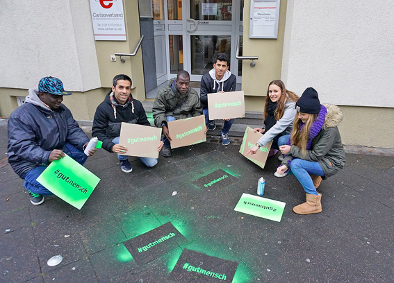 Auch die Caritasmitarbeiter Juliane Wetzlar, Martin Afagh und die Praktikantin Johanna Strömer sowie einige Klienten der Caritas-Flüchtlingshilfe haben sich auf den Weg gemacht, um #gutmensch auf die Bürgersteige vor Caritaseinrichtungen in Euskirchen zu sprayen.