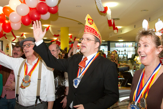 Udo Becker und Holger Glück zeigten derweil, dass sie zu manchen Scherz und traditionellem „Bützje“ bereit sind und präsentierten sich zusammen mit Iris Esselborn, die zum Orgateam des Prinzenempfangs gehörte und daher ebenfalls so manchen Orden überreicht bekam, als humorvolle Gastgeber. Manche KSK-Mitarbeiter hatten sich bei der Kostümwahl abgesprochen: So tummelte sich eine Gruppe Eichhörnchen im S-Forum, während eine Hasengruppe ungewöhnlich einträchtig mit einer Jägerschar feierte.