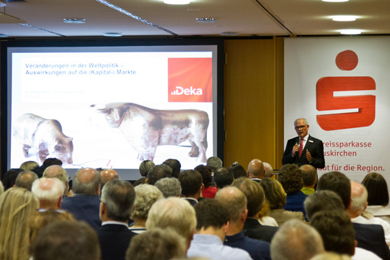 Volkswirtschaftsexperte Dr. Holger Bahr war aus der Finanzmetropole Frankfurt nach Euskirchen gekommen, um im Verwaltungszentrum der Kreissparkasse über die Zusammenhänge von Weltpolitik und Weltwirtschaft zu referieren – Größere Erträge seien auch in zinsarmen Zeiten möglich, aber nur mit der richtigen Strategie und einem höheren Risiko