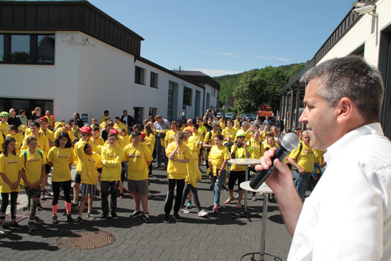 Dann aber hieß es „Schussfahrt nach Kall“. Zwar musste bis zur Victor-Neels-Brücke das Rad noch einmal geschoben werden, schließlich aber ging es mehr oder weniger sacht zu Tal bis auf den Hof der ene-Unternehmensgruppe, die in diesem Jahr die 120 Radler in Empfang nahm und für die müden Sportler als Energieversorger im wahrsten Sinne des Wortes auftrat. Geschäftsführer Markus Böhm und sein Team rund um Sandra Ehlen hatten einen großen Zielbogen errichtet und alles perfekt getimt, so dass beim Eintreffen des Trosses auf Knopfdruck die Hymne der großen Fairplay-Tour ertönte. Auf dem Hof der „ene“ hatte sich darüber hinaus viele Eltern eingefunden, um ihre Schützlinge in Empfang zu nehmen und ihnen einen herzlichen Empfang zu bereiten.