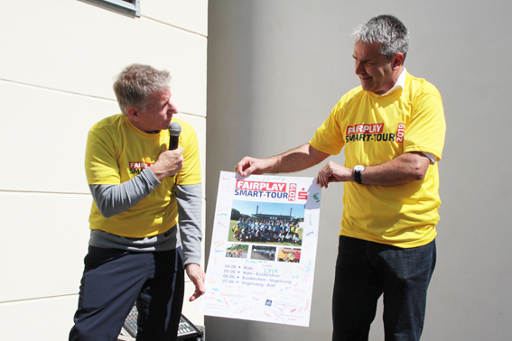 Tolle Unterstützung habe man wieder einmal vom CAP-Markt der Nordeifelwerkstätten (NEW) erhalten, der die Sportler mit Getränken versorgte. Die Kreissparkasse Euskirchen (KSK) gehört zu den größten Sponsoren der Tour. In diesem Jahr griff sie gleich zwei Mal tief in die Tasche, um nicht nur die Übernachtung, Abendprogramm und Versorgung in Euenheim zu ermöglichen, sondern auch die auf Burg Vogelsang. KSK-Vorstandsmitglied Hartmut Cremer und die Direktorin des KSK-Vorstandsstabs, Rita Witt, erhielten für ihr großes Engagement das diesjährige gelbe Trikot der Tour.