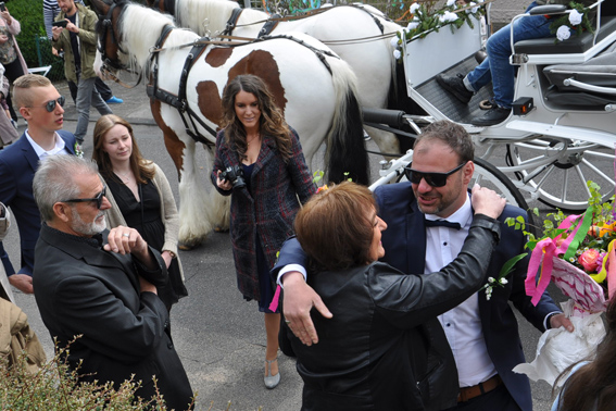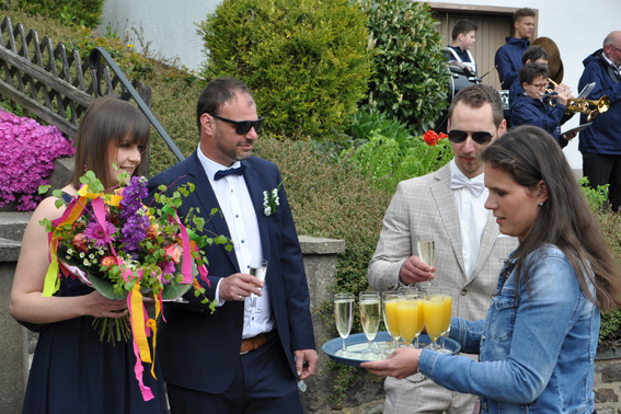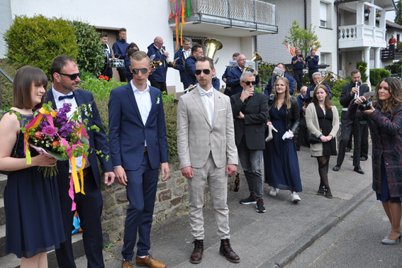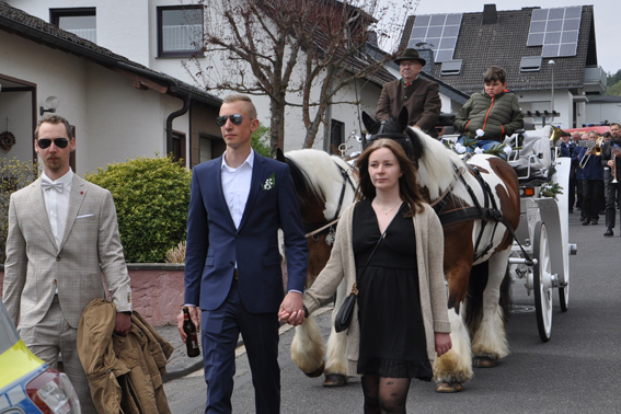 Über die Aachener Straße ging es über den Amselweg zur Wohnung auf dem Knoppen, wo Nachbarn die Bäume und Sträucher mit bunten Bändern geschmückt hatten. Einen Blumenstrauß reichte der Maikönig seiner zukünftigen Schwiegermutter, mit einem zweiten Strauß holte Christian Poensgen seine Rabea an der Haustür ab.