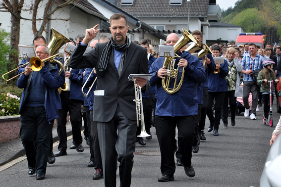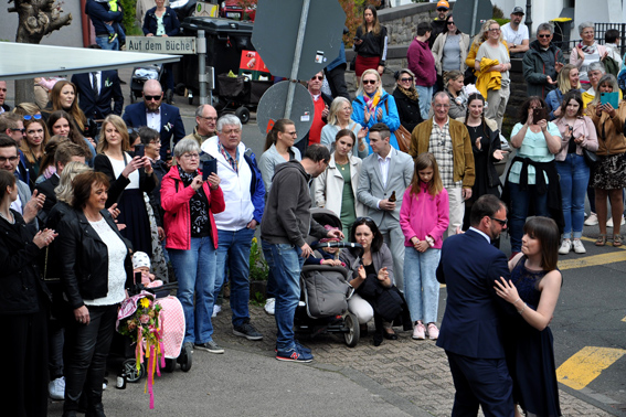 Während eines Umtrunks auf der Straße bedankte sich Hötjong David Dietsch bei den Junggesellen des „Geloogs“ sowie bei den Kallern für deren Unterstützung. Bevor das Königspaar mit der Kutsche zum Saal Gier gefahren wurde, intonierte die Musikkapelle den Frühlingswalzer „Der Mai ist gekommen“, zu dem der Maikönig seine Königin zum obligatorischen Maitanz auf der Straße bat.