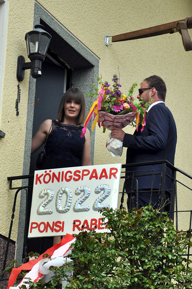 Die Sonne lachte dem Maikönigspaar Christian Poensgen und Rabea Blens – Umtrunk und Walzer auf der Straße – Blumenstrauß für die zukünftige Schwiegermutter – Bürgermeister gratulierte beim Maiball