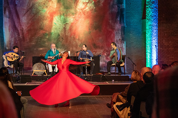Köln/Mechernich – „Das war ein wunderbares Konzert, ich fühle mich reich beschenkt“, sagte eine Besucherin vom Konzert „CHODA“ in der Lutherkirche Südstadt Köln. Vor ausverkauften Plätzen hatte der persische Meistermusiker Davood Azad am vergangenen Samstagabend eineinhalb Stunden lang für Klänge gesorgt, die sichtlich die Herzen der Zuhörenden öffneten und ein seliges Lächeln auf viele Gesichter zauberte. Zusammen mit seinen Musikerkollegen Amin Haydari (Oud, eine Kurzhalslaute), Mehrdad Masoudi (Kamantsche, eine Stachelgeige) und Mostafa Narimani (Rahmentrommel Daf) zeigte Azad nicht nur sein beeindruckendes Können auf dem Saiteninstrument Tar sowie als Sänger und Spieler weiterer Instrumente wie Setar und Daf. Er gab zudem im wahrsten Sinne des Wortes eine Bühne für die beiden Tänzerinnen Özlem und Shahrazad. Diese führten nicht nur den Darwisch-Drehtanz „Sama“ auf mit den wallenden Kleidern auf: Shahrazad in weißem Kostüm erschien dem Publikum als überdimensionaler Engel mit „Flügeln“ von sechs Metern Spannweite.