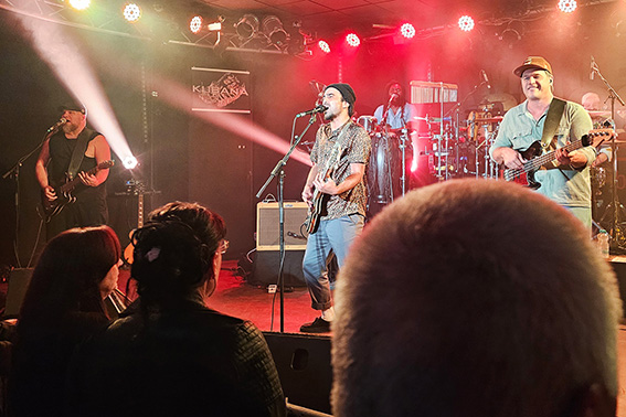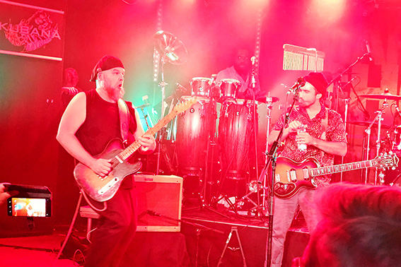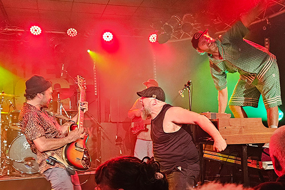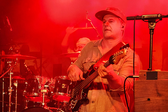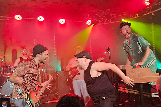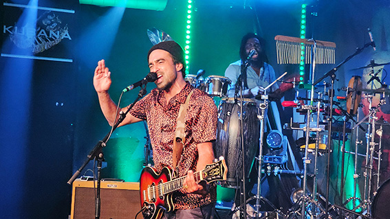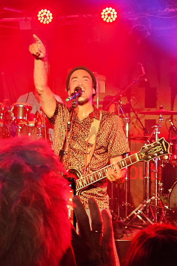 Zusammengehalten wird das Ganze vom Bassisten Christian Golz, der an der Musikschule Euskirchen auch gleich für den Nachwuchs sorgt. Der Meister der tiefen Töne entlockt seiner Bassgitarre nicht nur die fetten Reggae-Sounds, sondern streut auch moderne Grooves ein und gibt dadurch jene Frische, die auch jüngere Hörer im Heavy-Metal-Shirt abholt. Der aus Chicago stammende Lead-Gitarrist Matt Sonnicksen kreiert auf seinem Instrument mal bluesige, mal rockige Töne, knüpft mit dem „jaulenden“ Effekt-Pedal „Wah-Wah“ an die geliebten Gitarren-Sounds der 1970er Jahre an, tanzt dabei mit nackten Füßen auf der Bühne oder auch mal kurzzeitig im Publikum. Dazu ist Matt verschmitzter Moderator des Abends, stellt seine Bandkollegen mit viel Herz, Fist-Bumps und Umarmungen vor und preist die Merchandising-Produkte zur Freude des Publikums bei amerikanischem Akzent mit kölschem Einschlag an: „Wir haben Jute-Taschen, dat sind eeeeecht jute Taschen!“