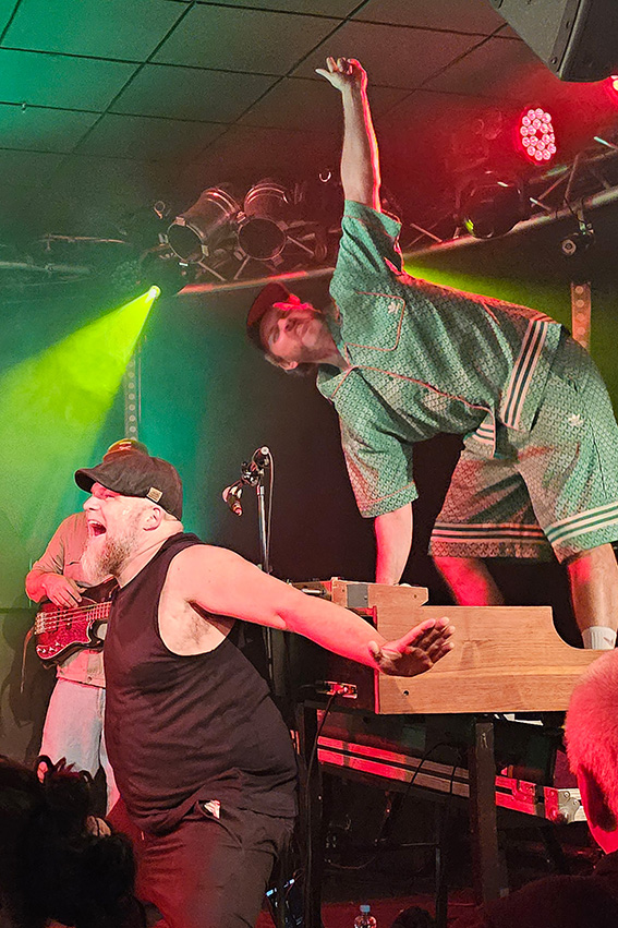 An der selbstgebauten zweimanualigen Orgel, einem Keyboard, einem kleinen Synthie und einem Soundpad und zusätzlichen Effektgeräten sorgt derweil Joonas Lorenz für Klänge von entrückten Sphären bis zur erdig blubbernden „Reggae Bubble“, wie die typischen rhythmischen Akkordbrechungen an den Keys genannt werden. Mit ausdrucksvoller Mimik und seiner unbändigen Energie sorgt er nicht nur an, sondern im Solo auch unter, hinter und auf der Orgel mit akrobatischen Einlagen und viel „Understatement“ für abgedrehte Sounds wie einschmeichelnde Melodien.