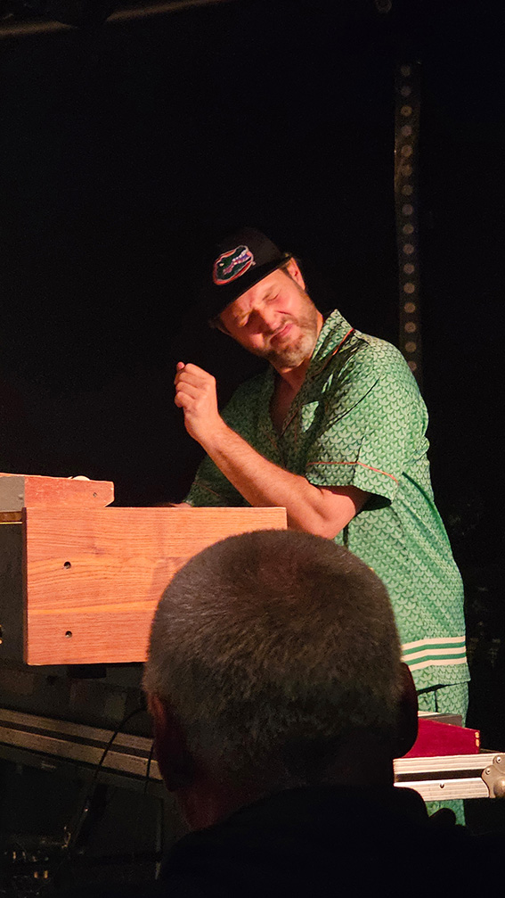 An der selbstgebauten zweimanualigen Orgel, einem Keyboard, einem kleinen Synthie und einem Soundpad und zusätzlichen Effektgeräten sorgt derweil Joonas Lorenz für Klänge von entrückten Sphären bis zur erdig blubbernden „Reggae Bubble“, wie die typischen rhythmischen Akkordbrechungen an den Keys genannt werden. Mit ausdrucksvoller Mimik und seiner unbändigen Energie sorgt er nicht nur an, sondern im Solo auch unter, hinter und auf der Orgel mit akrobatischen Einlagen und viel „Understatement“ für abgedrehte Sounds wie einschmeichelnde Melodien.