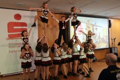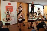 Schließlich aber war Showtime angesagt: 28 Mädels und ein Junge zwischen 9 und 14 Jahren der Cheer-Dance-Company aus Billig eroberten unter dem Motto „Love is in the air“ die Bühne und sorgten mit ihrer akrobatischen und tänzerischen Darbietung für Hochstimmung im S-Forum. Die Begeisterung am Tanz, die die jungen Leute ausstrahlten, dürfte vor allem von ihrer Trainerin Laura Kuschneruk ausgehen, die selber Tänzerin des 6-fachen deutschen Meisters „High Energy Showtanz“ ist und daher weiß, wie man die Herzen der Zuschauer im Sturm erobert. Angesichts der Tatsache, dass die Tanzenden noch im Wachstum waren und schon jetzt mit dem Kopf an die Decke des S-Forums stießen, scherzte Udo Becker: „Wenn ihr im nächsten Jahr wiederkommt, könnt ihr euren großen Durchbruch bei der Sparkasse erleben.“