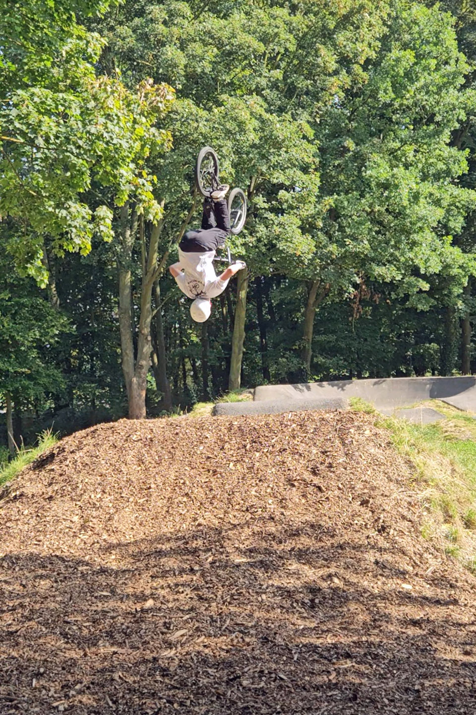 Für die Medienvertreter hatten am Pumptrack einige junge Radkünstler recht gewagte akrobatische Einlagen einstudiert. Sogar ein Rückwärtssalto mit dem Rad, ein sogenannter „Backflip“, gehörte zum Programm.