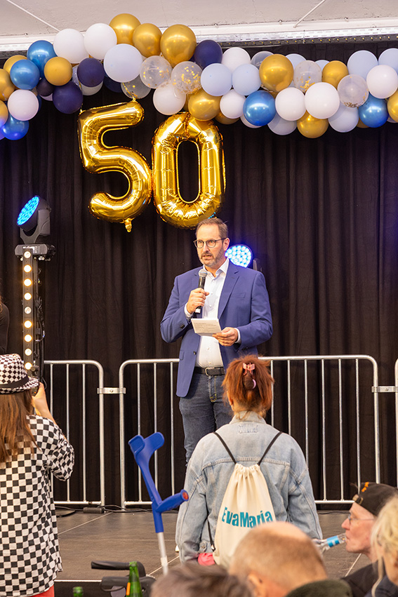 Euskirchen – Fünf Jahrzehnte Nordeifel.Werkstätten (NE.W), das heißt 50 Jahre Einsatz für Menschen mit Behinderung im Kreis Euskirchen. Das musste natürlich gefeiert werden – aber auch dabei sollten, wie NE.W-Geschäftsführer Christoph Werner betonte, die rund 1200 Beschäftigten, also Menschen mit verschiedensten körperlichen, psychischen und kognitiven Handicaps, im Mittelpunkt stehen. Und dies ist Werner und seinem aus rund 300 hauptamtlichen Mitarbeitenden bestehenden Team am vergangenen Donnerstag in der Feuerhalle Alte Tuchfabrik Euskirchen begeisternd gelungen. Betriebsleiter standen den gesamten Tag hinter der Kaffeemaschine und schenkten den Beschäftigten auch am Ende des langen Tages noch mit einem Lächeln das begehrte Heißgetränk ein. Die NE.W eigenen Küchenteams sorgten für das leibliche Wohl, unterstützt vom inklusiven CAP-Supermarkt. Die inklusive Haus-Band Kontraste brachte die Menge zum Jubeln, Tanzen und Klatschen, ebenso wie der Auftritt der Tanzgruppe. Die Moderation des Tages übernahm gekonnt der in der IT angestellte Rene Blum.