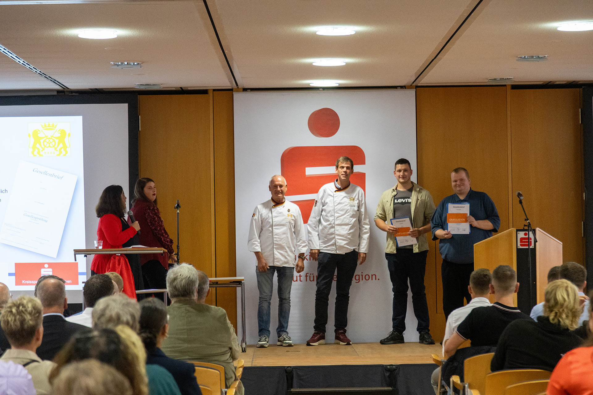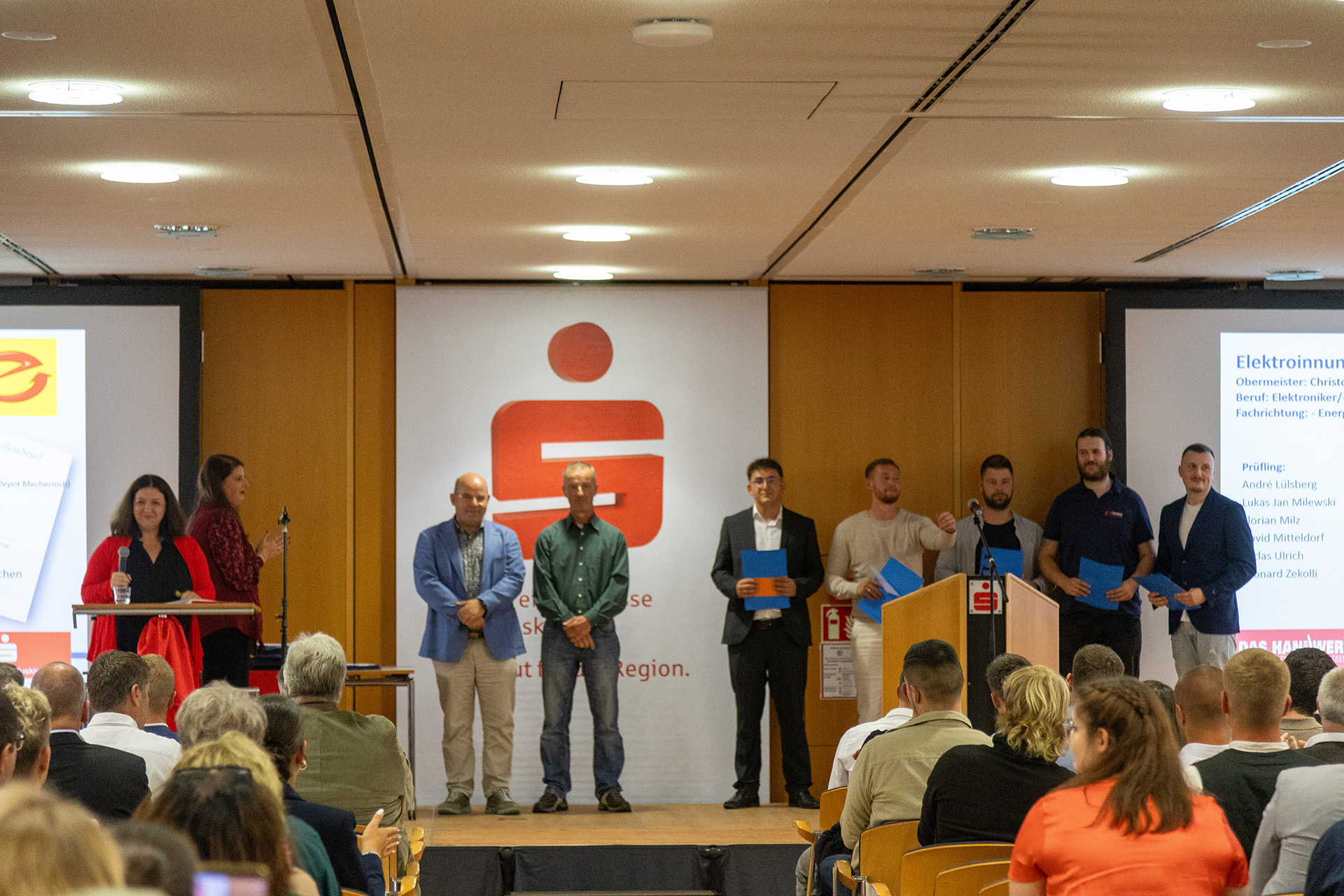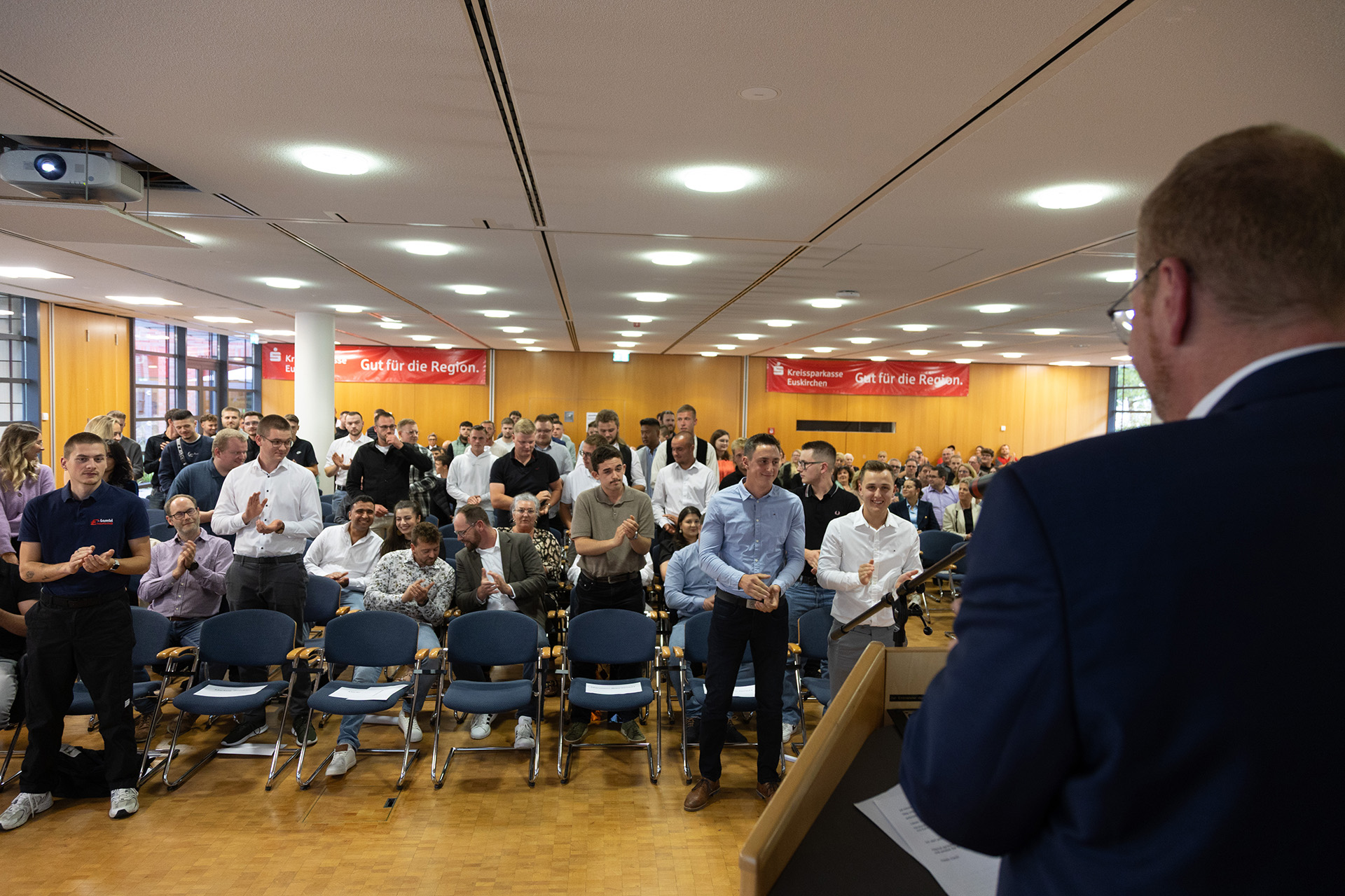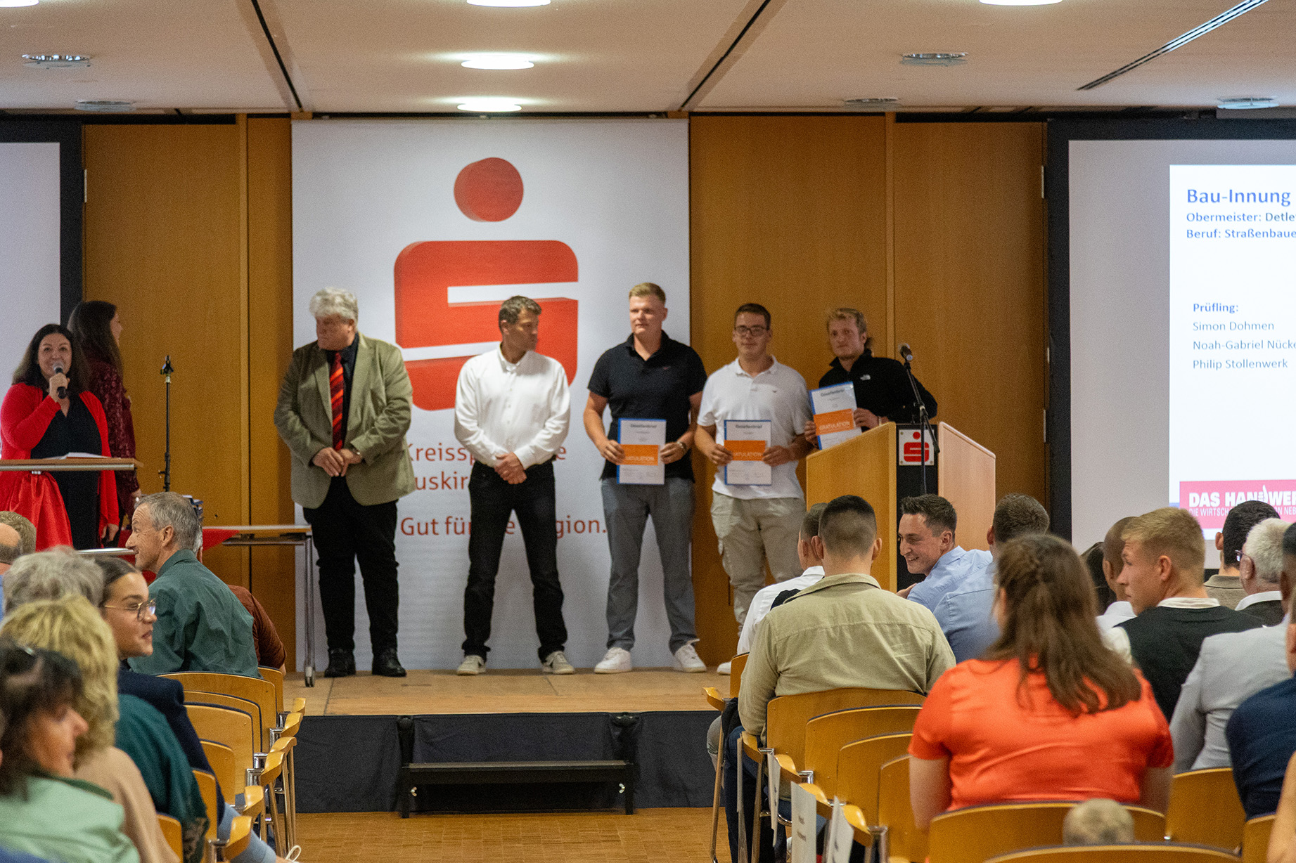 Hausherr Udo Becker, Vorstandsvorsitzender der KSK, war vor seinem Grußwort sichtlich bewegt, denn Jessica Kuhn und Kreishandwerksmeister Thomas Rendenbach sowie die Verwaltungsfachwirtin Maren Deuster, die die Lossprechungen im Vorfeld organisiert, bedankten sich auf der Bühne für die herzliche und unterstützende Zusammenarbeit.