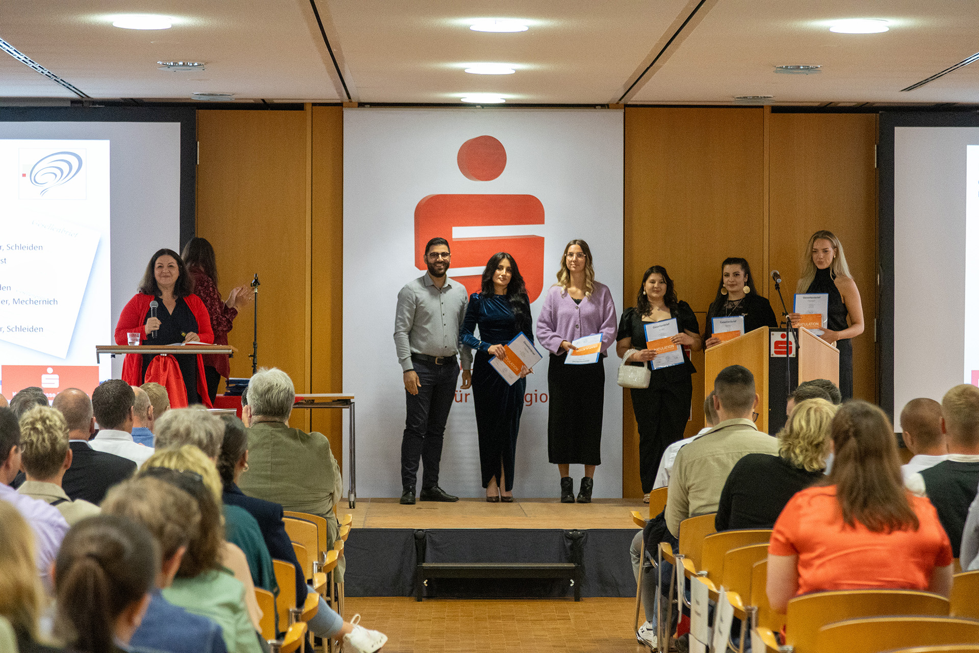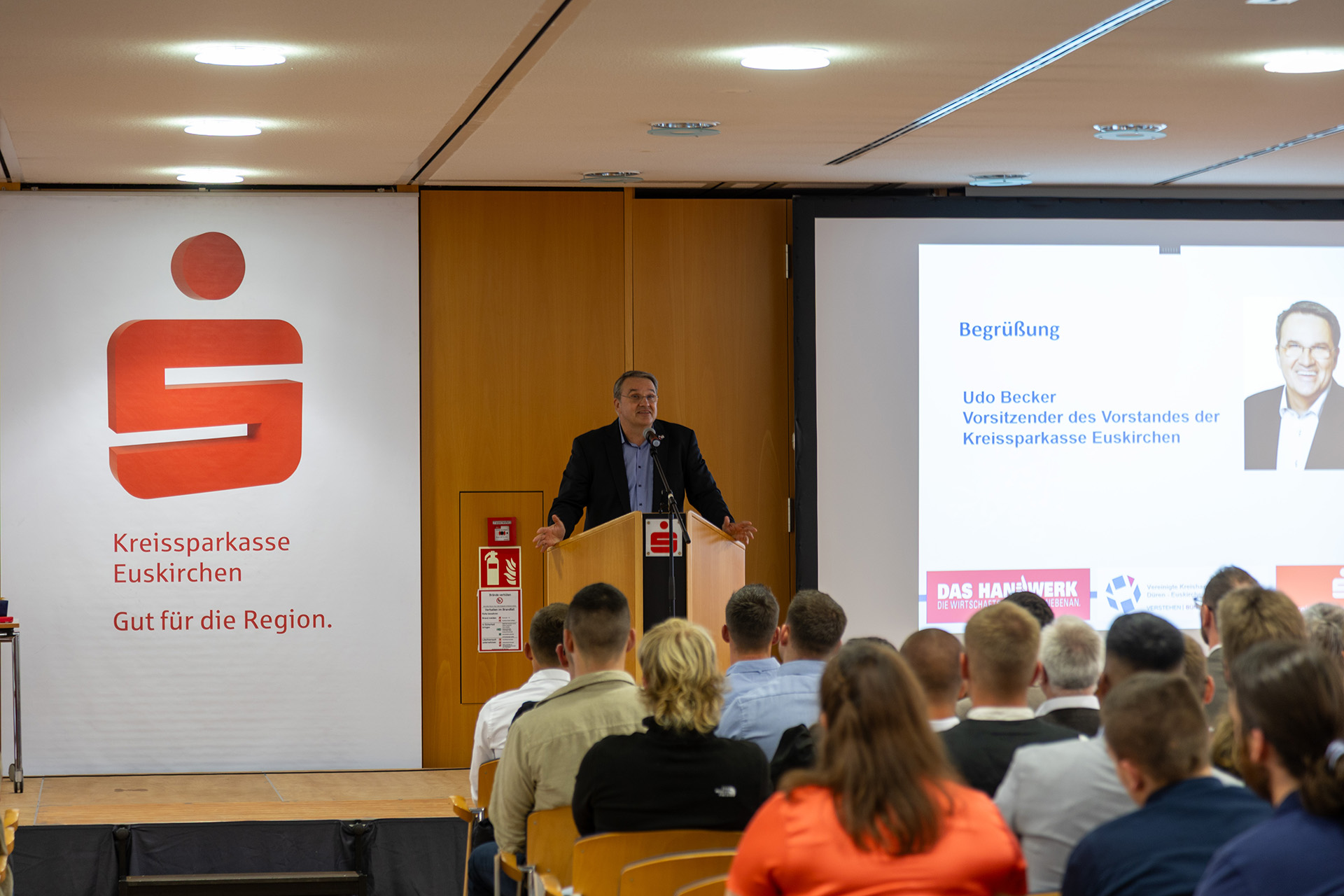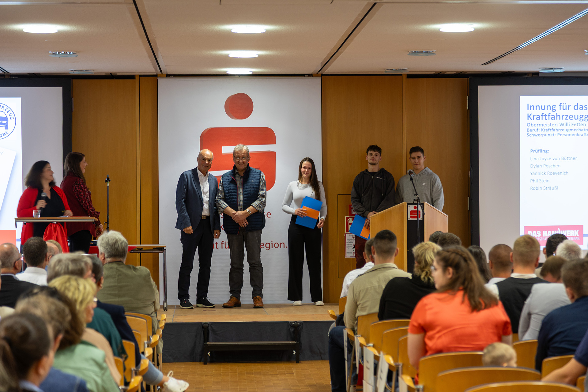 Hausherr Udo Becker, Vorstandsvorsitzender der KSK, war vor seinem Grußwort sichtlich bewegt, denn Jessica Kuhn und Kreishandwerksmeister Thomas Rendenbach sowie die Verwaltungsfachwirtin Maren Deuster, die die Lossprechungen im Vorfeld organisiert, bedankten sich auf der Bühne für die herzliche und unterstützende Zusammenarbeit.