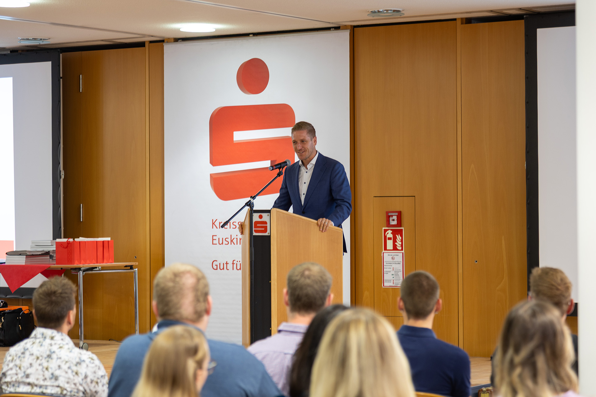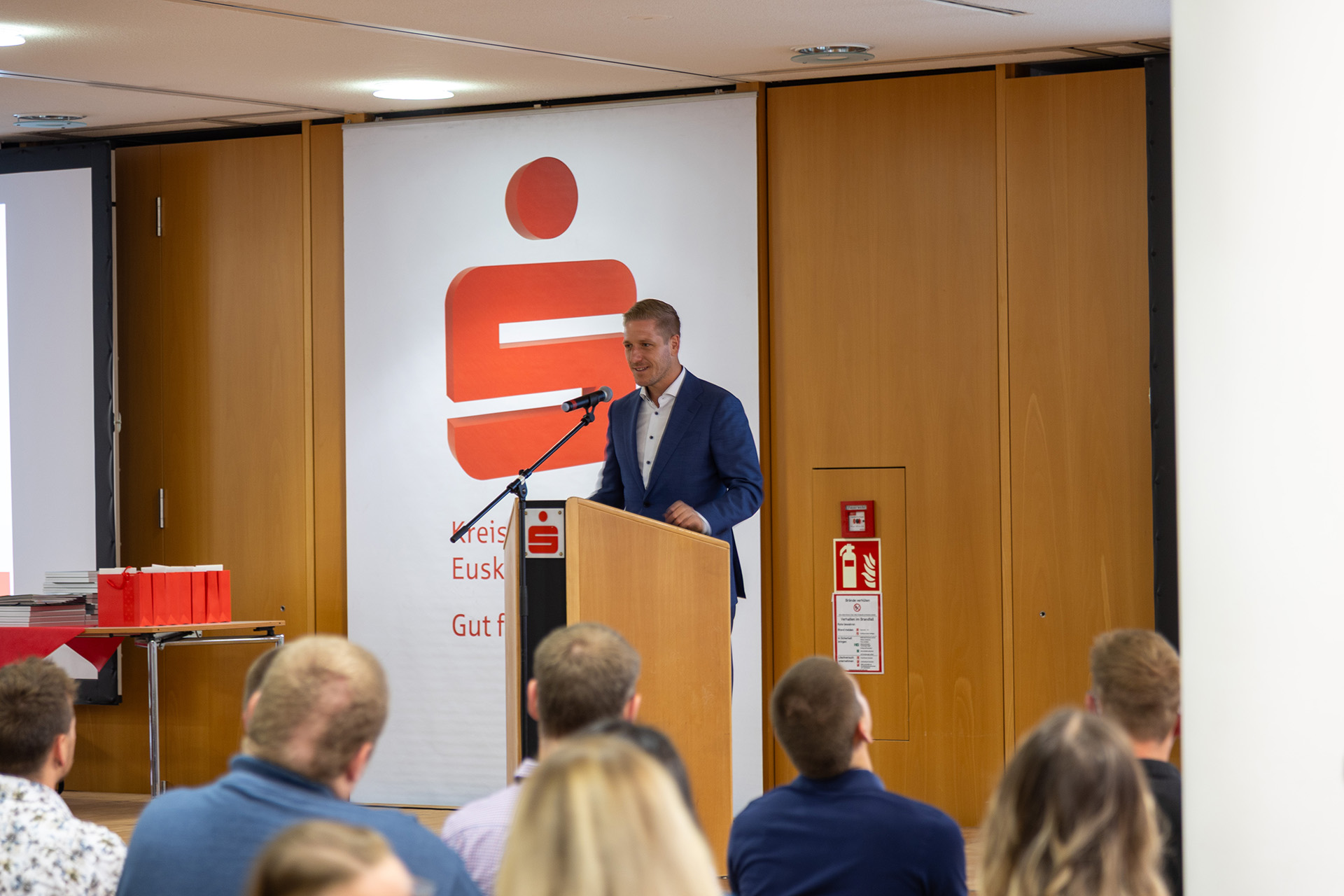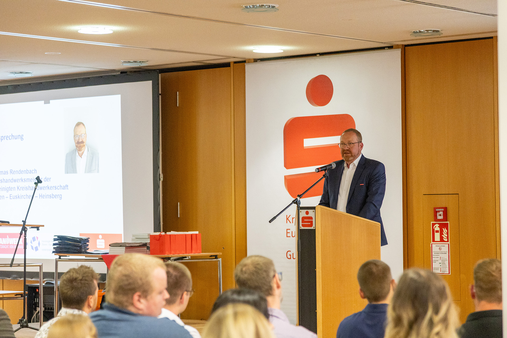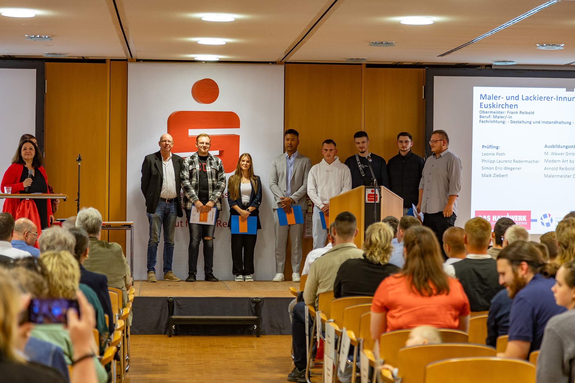 Hausherr Udo Becker, Vorstandsvorsitzender der KSK, war vor seinem Grußwort sichtlich bewegt, denn Jessica Kuhn und Kreishandwerksmeister Thomas Rendenbach sowie die Verwaltungsfachwirtin Maren Deuster, die die Lossprechungen im Vorfeld organisiert, bedankten sich auf der Bühne für die herzliche und unterstützende Zusammenarbeit.