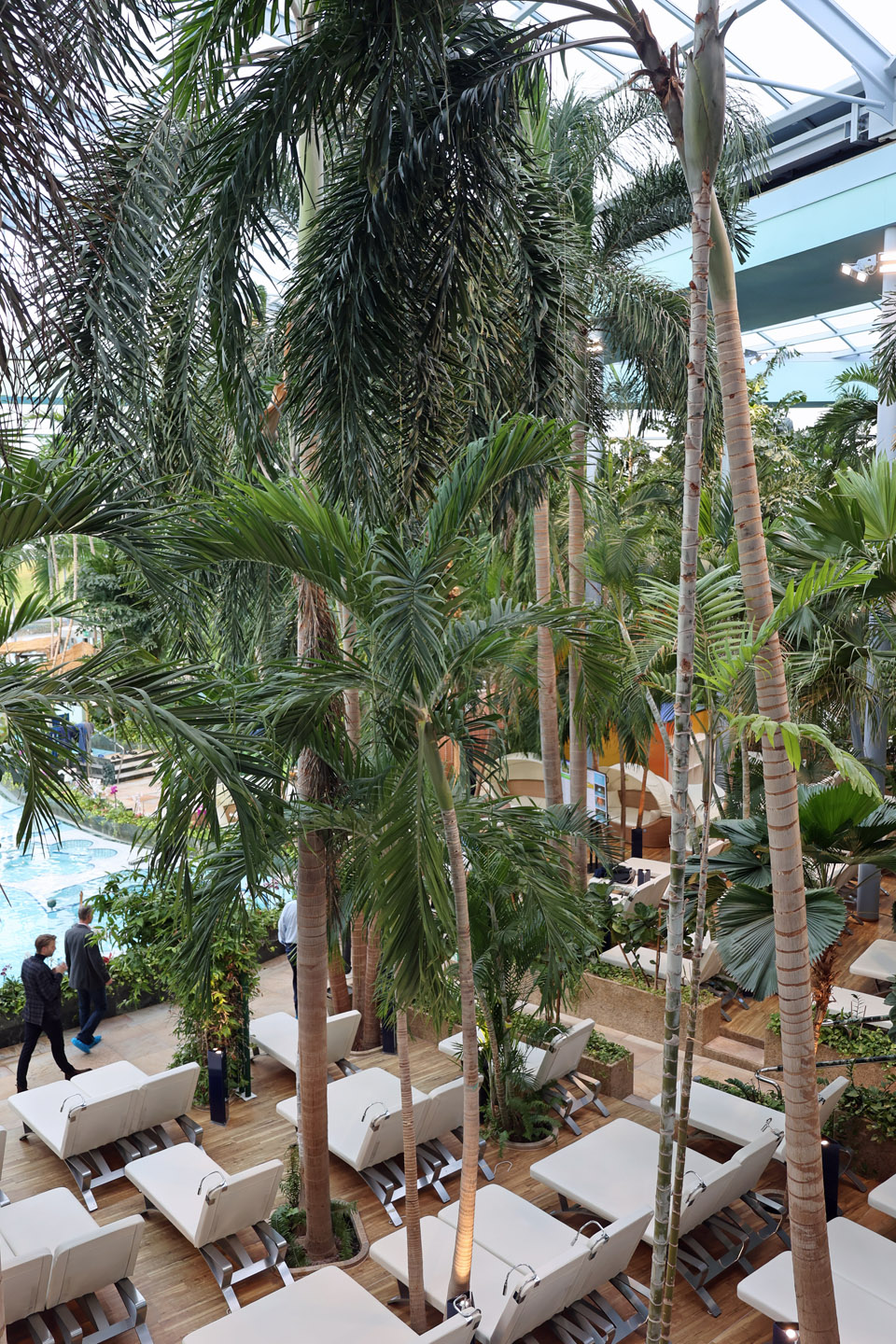 Mit einigen imposanten Daten konnte Melinda Atzori gleich zu Beginn aufwarten. Allein das Palmenparadies umfasst eine Gesamtfläche von 3000 Quadratmetern. In der Großen Lagune herrschen beständig 33 Grad Wassertemperatur. Es gibt dort zusätzlich Poolbars, Whirlpools, ein Dampfbad, diverse Gesundheitsbecken und eine Textilsauna. Die 200 Tonnen schwere bewegliche Dachfläche von 1750 Quadratmetern ist über 18 Meter hoch. Aber das Erstaunlichste sind die allerorts anzutreffenden echten Palmen, über 500 Stück, die zwei bis zwölf Meter in die Höhe ragen und den unverwechselbaren Charme der Therme ausmachen. Gleich 20 Gärtner kümmern sich um die tropischen Bäume.