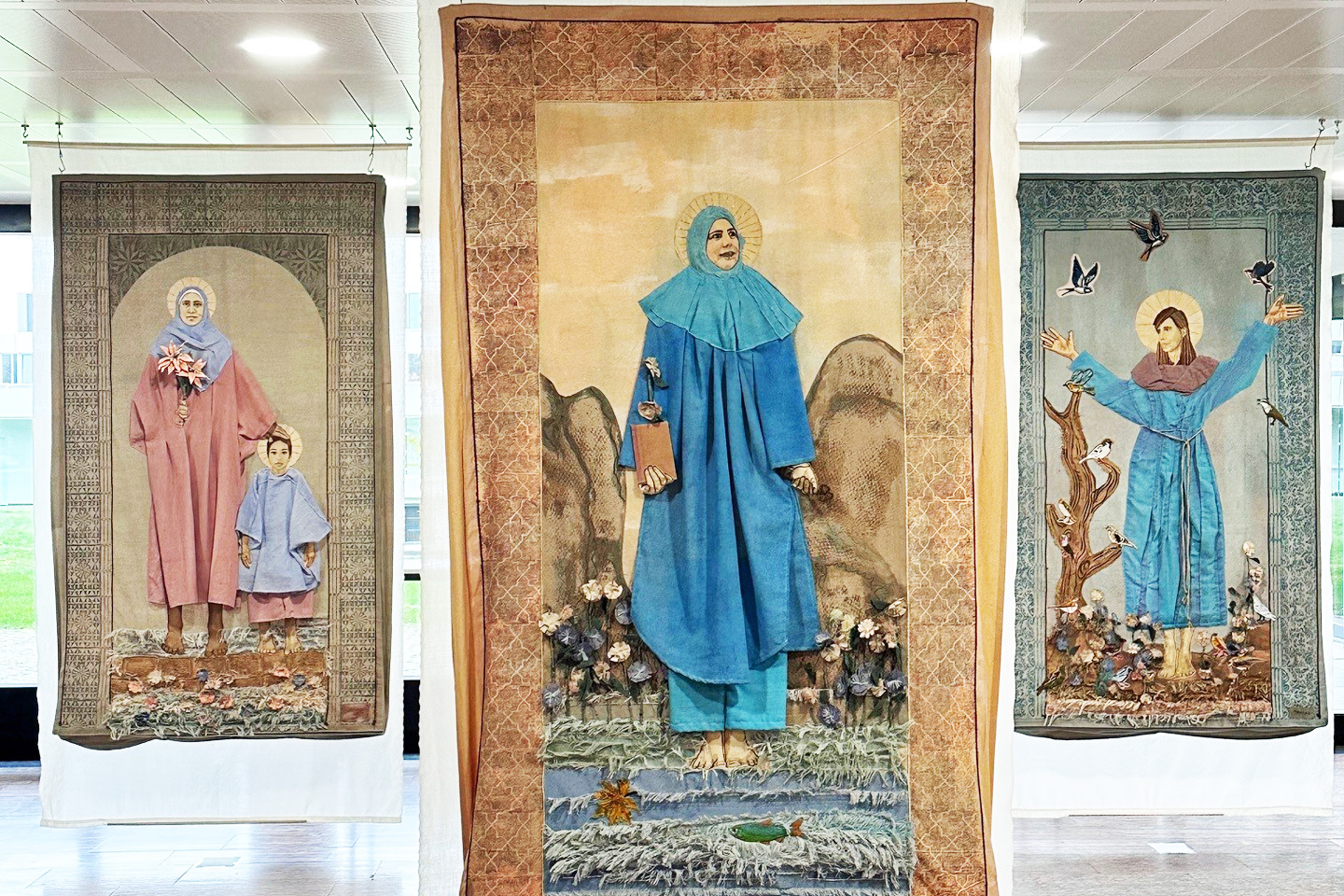 Die Ausstellung der kunstvoll gefertigten Exponate eröffnet neue Perspektiven auf Macht, Würde und gesellschaftliche Rollenbilder. In großformatigen Bildteppichen werden Frauen, die oft von Mehrfachdiskriminierung betroffen sind, in die Rollen traditionell männlicher Heiliger gesetzt. Damit bricht die Ausstellung bewusst mit jahrhundertealten ikonografischen und kulturellen Bildern.