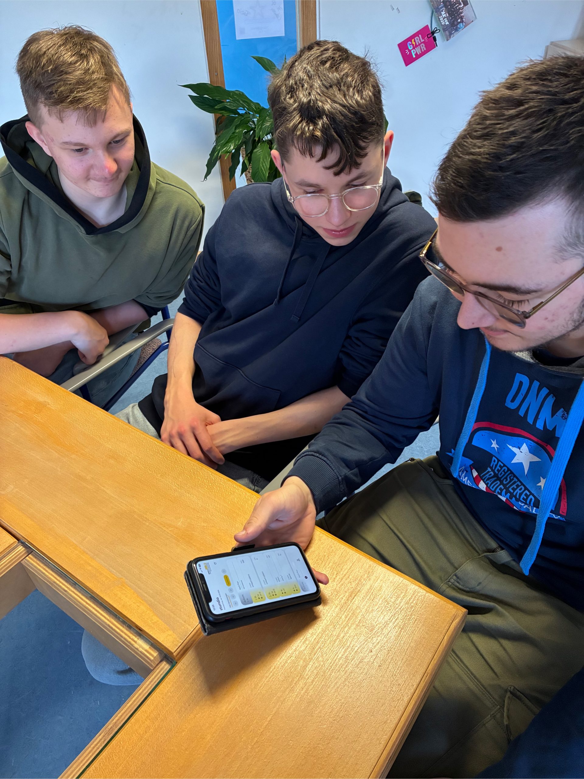Conner, Florian und Martin (v.l.), Schüler der Städtischen Realschule Bad Münstereifel, sind Fans der Schul-App, die Miguel Cortina Zapp, 20jähriger IT-Student und Start-up-Gründer von „stundio.de“ individuell für die Schule entwickelt hat. Foto: Rita Witt