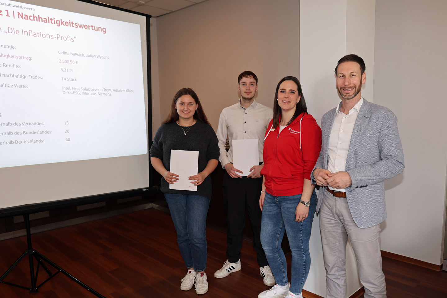 Platz eins in der Nachhaltigkeitswertung beim Sparkassen-Azubiwettbewerb erzielte das Team „Die Inflations-Profis“ mit Celina Barwich und Julian Wygand, die einen Nachhaltigkeitsertrag von 2.500 Euro erzielten. Platz eins in der Depotgesamtwertung holten sich die KSK-Azubis Faye Wollenweber, Celine Tissen und Alexander Friesen vom Team „CAF“, das einen Depotgesamtwert von 53.404 Euro vorweisen konnte.