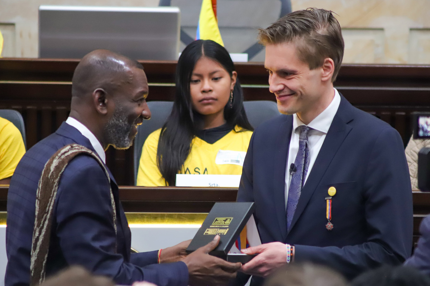 Dr. Theodor Rüber (re), Gründer Verein CASA HOGAR, bei der Preisverleihung im Kongress der Republik Kolumbien. Foto: CASA HOGAR
