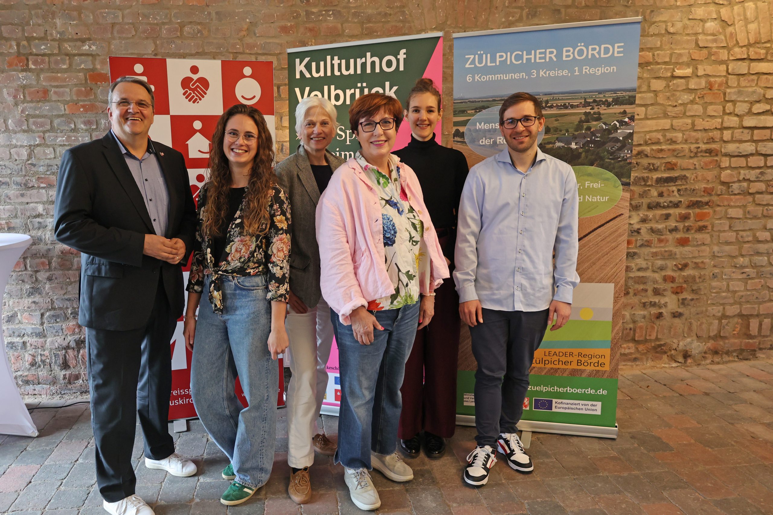 Zogen Bilanz und stellten die weiteren Vorhaben des Mundart-Projekts vor: KSK-Vorstandsvorsitzender Udo Becker (v.l.), Projektmanagerin Annika Esch, die Leiterin des Kulturhofs Velbrück, Marietta Thien, Carla Neisse-Hommelsheim (Vorsitzende der LAG Zülpicher Börde), Marie Marx (Ko-Regionalmanagerin LAG) und Sebastian Duif (Regionalmanager LAG). Bild: Michael Thalken/Eifeler Presse Agentur/epa