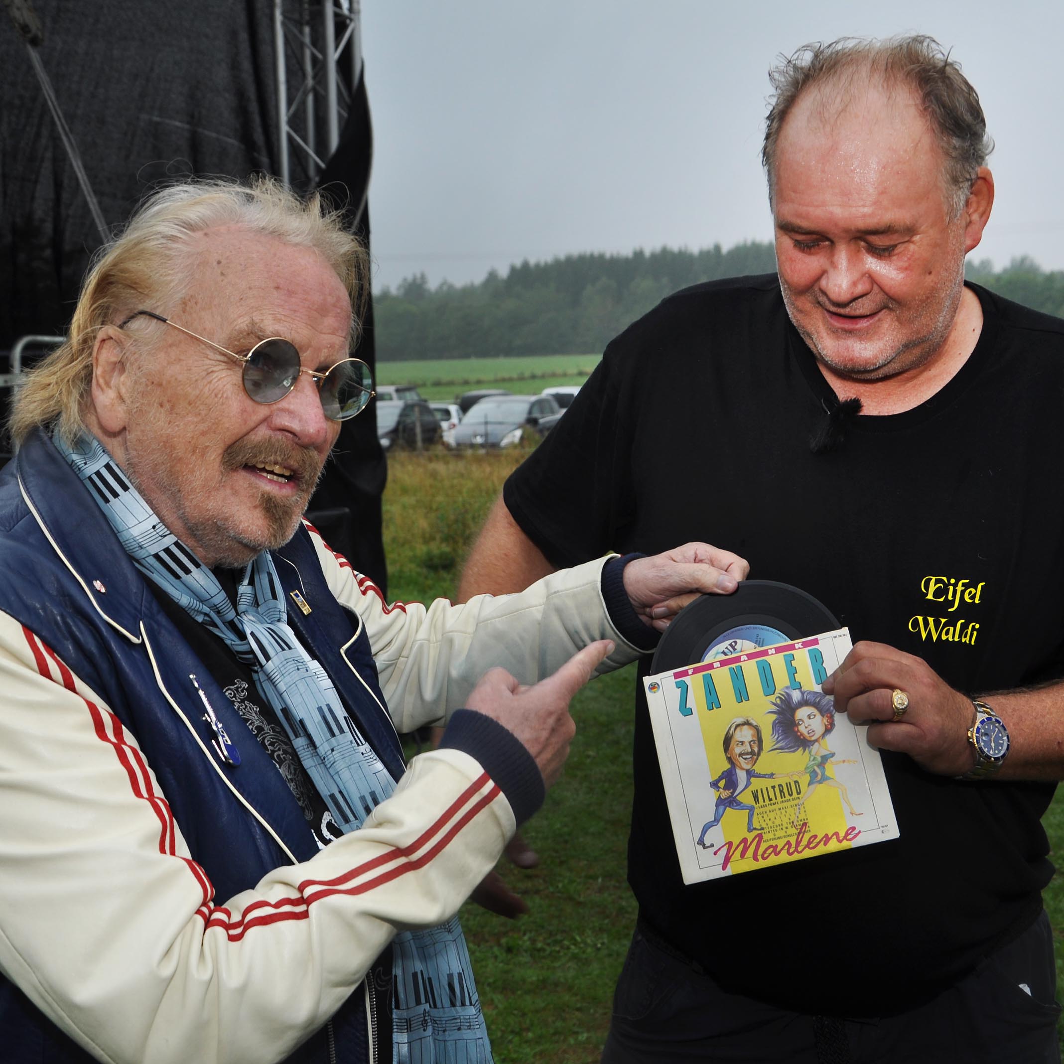 Schlager-Urgestein Frank Zander war eigens aus Berlin nach Krekel gekommen, um Walter Lehnertz zum Zehnjährigen eine Schallplatte mit dem Titel „Marlene“ zu schenken. Foto: Reiner Züll
