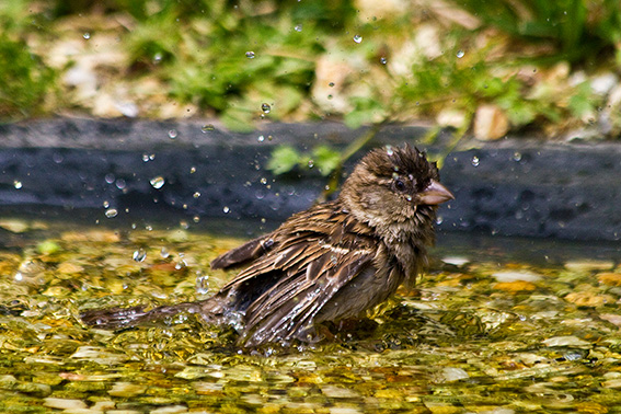 Ein Haussperling beim ausgiebigen Badespaß. Foto: NABU/Günter Lessenich