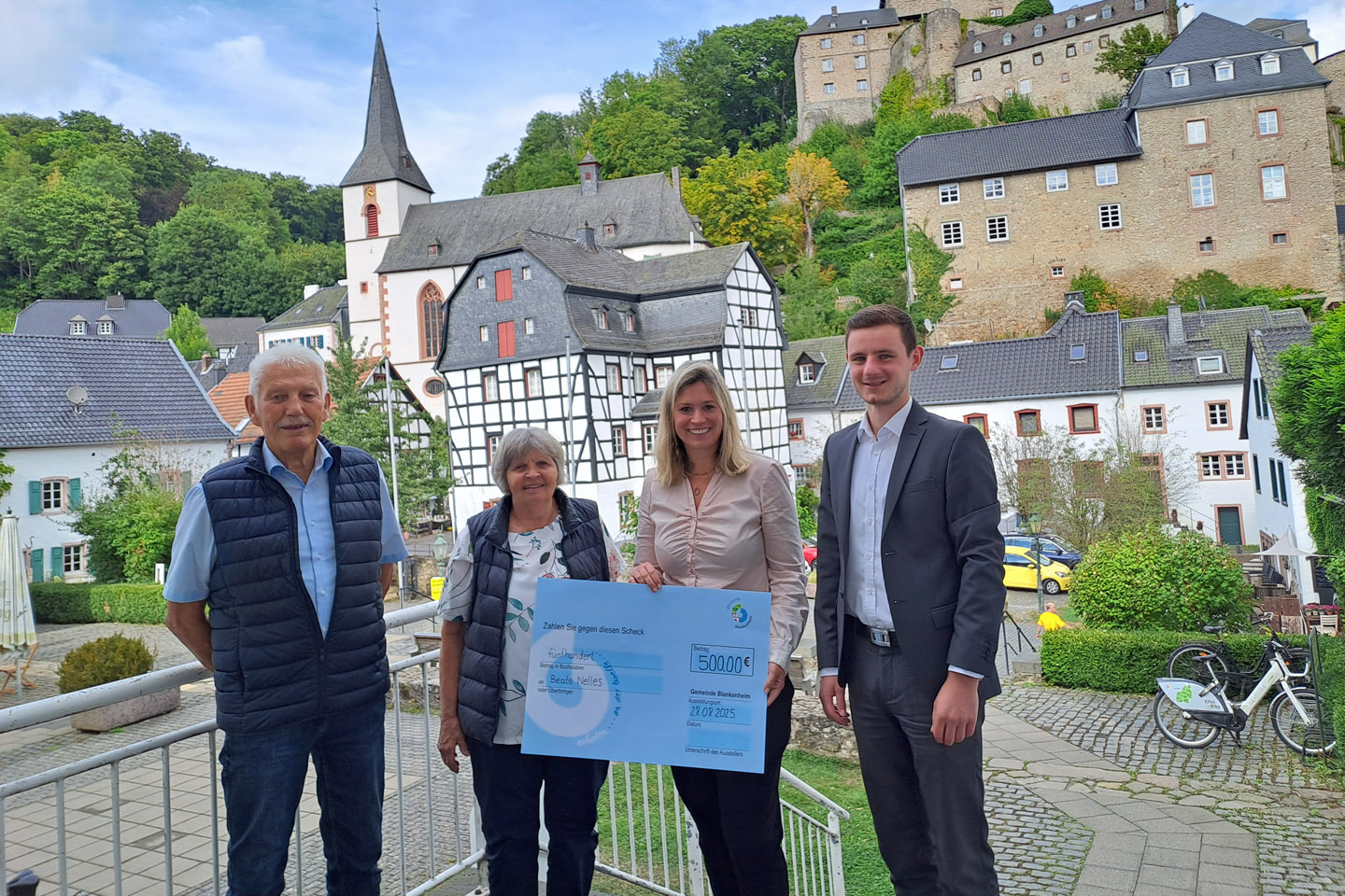 Roman Sohnius (Kreissparkasse Euskirchen) (v.r.) und die Bürgermeisterin der Gemeinde Blankenheim, Jennifer Meuren, übergaben den ersten Preis des Tour-de-Ahrtal-Gewinnspiels an Beate Nelles aus Schuld, die mit ihrem Mann angereist war. Bild: Gemeinde Blankenheim